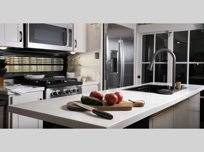 - Residential "Do it all" sink with pull-out kitchen faucet, glass rinse, and vegetable rinse