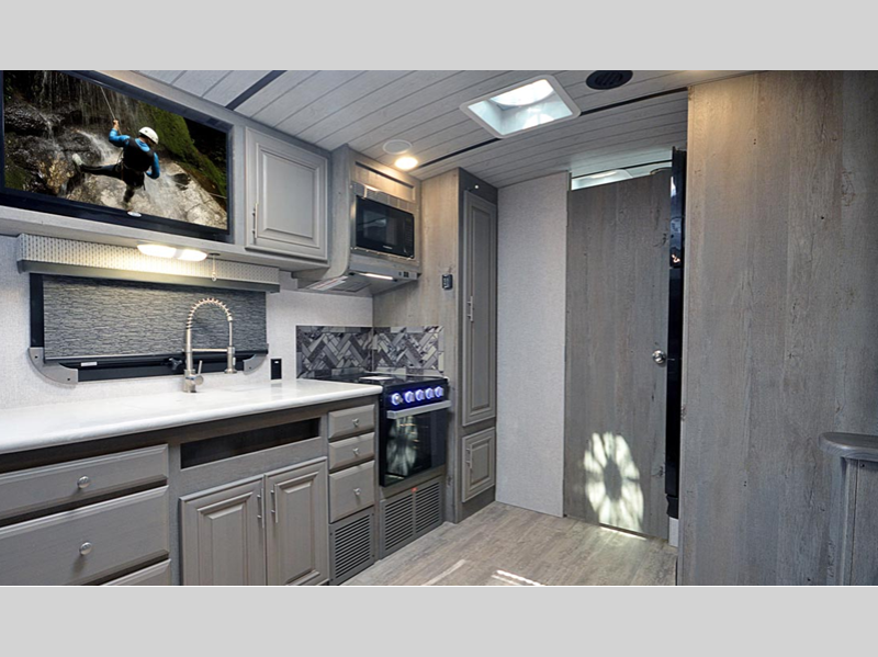 A leveling system will make setting up camp easier than ever, and SolX solar panels will provide off-grid power. Inside, you'll love custom one-piece formed countertops, solid surface kitchen and bath countertops, slow rise night shades, and many more comforts. The exterior is just as convenient with its slam latch luggage doors, outside speakers, heating holding tanks and more!